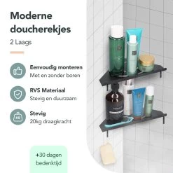 Doucherek Zonder Boren – RVS – Zelfklevend Doucherekje – Hangend – Hoek – Inclusief 2 Muurstickers