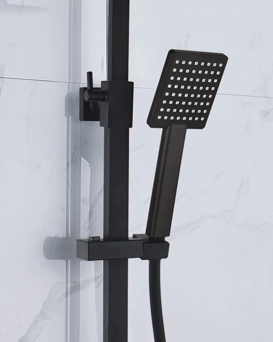 Luxe vierkante regendouche, compleet met vierkante thermostaatkraan en wisselknop weggewerkt in de linker handgreep. Ook de buis is vierkant uitgevoerd, waardoor hij echt strak modern is en consistent in design. De wisseling tussen de hoofddouche en handdouche zit en wisselknop weggewerkt in de linker handgreep.. Voorzien van een grote vierkante wellness-hoofddouche van maar liefst 30 cm en bijpassende hoekige handdouche. Centrale stang is in hoogte instelbaar tussen 71-114 cm, passend op de hoogte zoals jij dat wilt hebben.