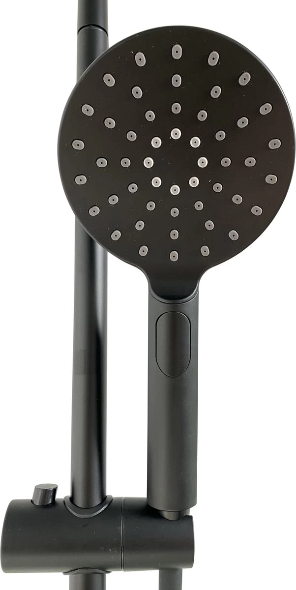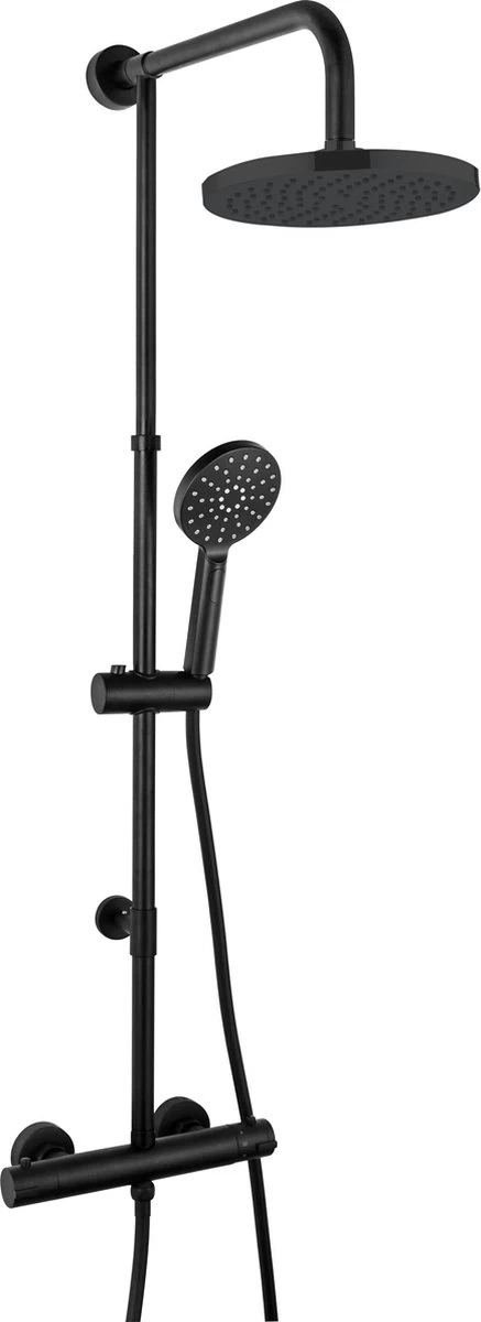 Luxe zwarte regendouche, compleet met thermostaatkraan en wisselknop weggewerkt in de linker handgreep. Hiermee wissel je van de handdouche naar de hoofddouche en omgekeerd. Voorzien van een grote wellness-hoofddouche (20cm) en 3 standen handdouche. Totaal hoogte instelbaar tussen 71 en 130 cm. De hart afstand van deze kraan is 15 cm en daarmee standaard voor 95% van alle badkamers. (Alleen hele oude huizen hebben soms 12cm hartsafstand. Hiervoor zijn bij bouwmarkten verloop koppelingen te koop).