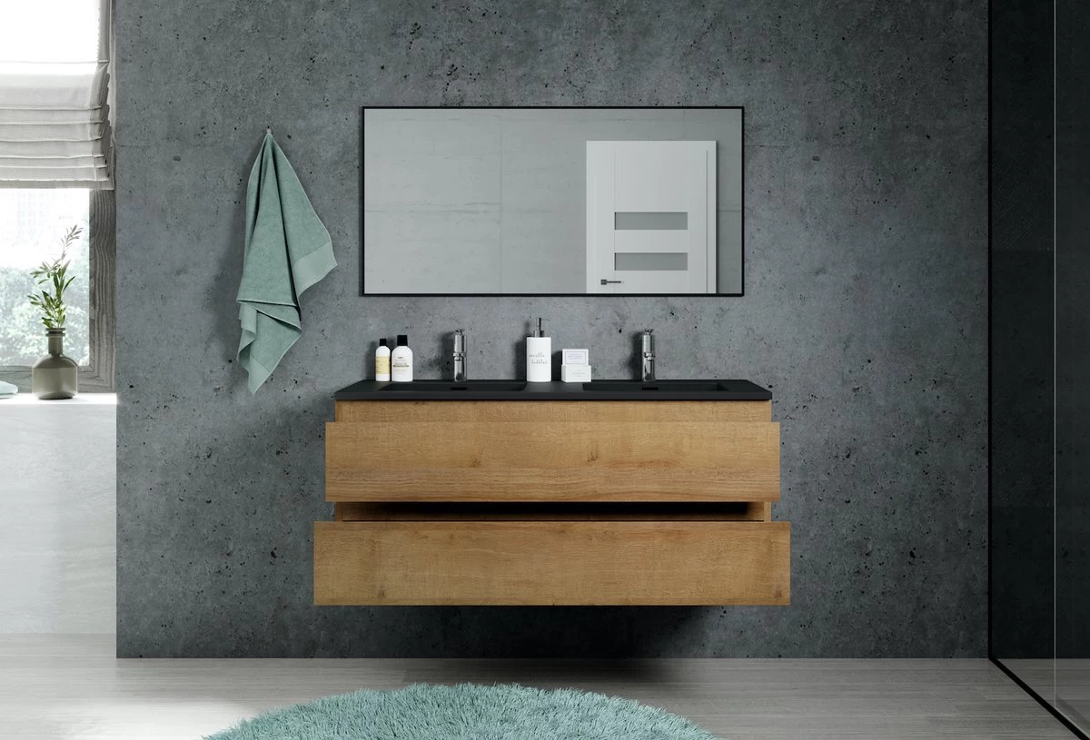 Badkamermeubel 120cm breed uitgevoerd met twee lades en dubbele wastafel. Uitgevoerd in een eiken kleur met een zwarte wastafel.Wastafel van kunstmarmer 120cm breed, 48cm diep. De onderkast is gemonteerd en met soft close afgesteld.Afmeting badkamermeubel: 120 x 48 x 53cm
