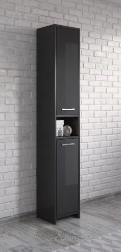 Staande badkamerkast Nemo is een stijlvolle kolomkast met meerdere opbergvakken voor extra opbergruimte in de badkamer. Vanwege zijn formaat is badkamerkast Nemo geschikt voor zowel grote als kleine badkamers. De kast is gemaakt van hoogwaardige kwaliteit spaanplaat voorzien van een fineerlaag. Montage is eenvoudig en al het benodigde montagemateriaal hiervoor is inbegrepen. De deuren van de kast kunnen zowel links als rechtsdraaiend gemonteerd worden. Deze kast wordt geleverd met pootjes waardoor deze niet aan de muur opgehangen hoeft te worden. De kast is uitgevoerd in zwart met hoogglans frontjes.
