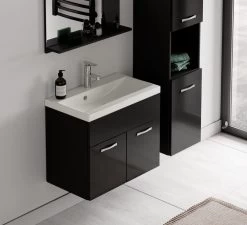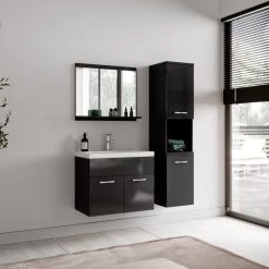 Vanwege zijn strakke afwerking is het meubel gemakkelijk schoon te maken. De set is volledig uitgevoerd in zwart met hoogglans frontjes en is gemakkelijk te monteren.