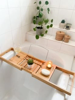 Deze uitschuifbare badplank geeft je nog meer ontspanning in bad met een drankje, boek, tablet, kaars of telefoon. Tevens staat het ook leuk ter decoratie. Plaats je tablet, boek en een glaasje wijn op deze badplank en begin te kijken/lezen terwijl je in bad zit. Er is nog voldoende plaats om kaarsen te plaatsen voor een extra gezellige sfeer. Doordat je de plank kan uittrekken (75 tot 105 cm) past deze badplank over elk bad. Hij steunt stevig op de zijkanten van je bad. Voor iedereen ultiem ontspannen met de meest favoriete items binnen handbereik! Hoge kwaliteit: De bamboe onderdelen zijn natuurlijk en duurzaam. Het bamboe is tot in detail afgewerkt, dit betekent geen splinters of barsten in het hout