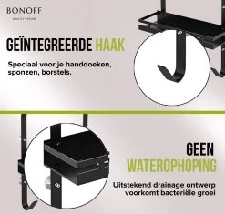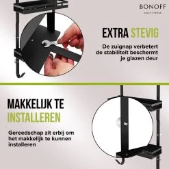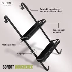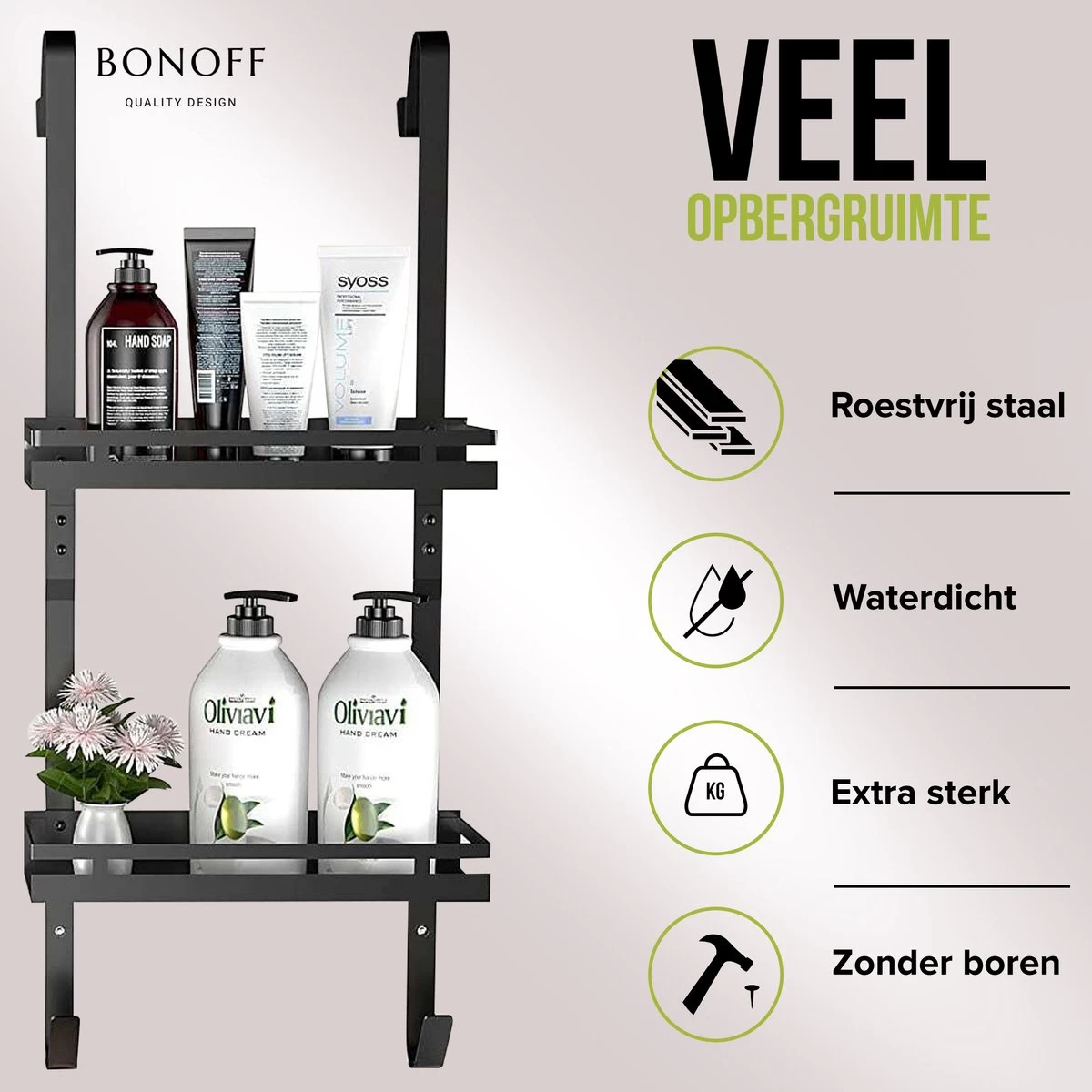 Bonoff 2 Laags Doucherek , makkelijk op te hangen zonder te boren, voor het opbergen van shampoo, douchegel, facewash of douchespons. Door de twee ruime lagen kun je hier al je douchespullen kwijt. Tevens kun je extra spullen ophangen aan de 2 handige haken aan de onderkant van dit mooie doucherek.