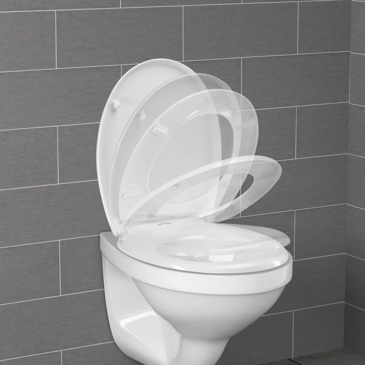 Bovendien sluit de toiletbril zacht en geruisloos dankzij het betrouwbare dubbele soft-close mechanisme. Het soft-close mechanisme wordt geactiveerd wanneer het toiletdeksel of de toiletbril omhoog staat.