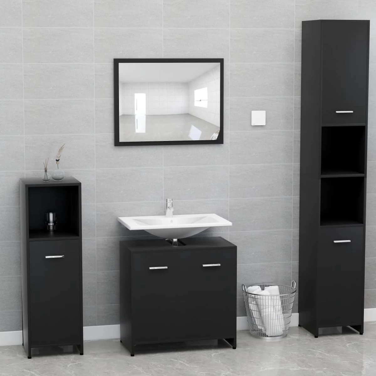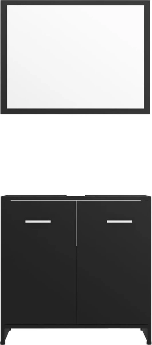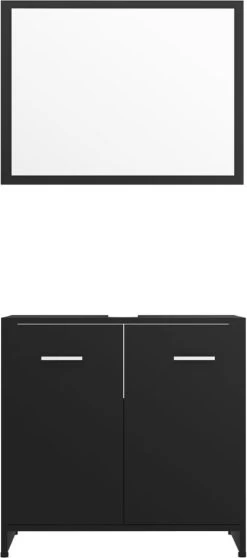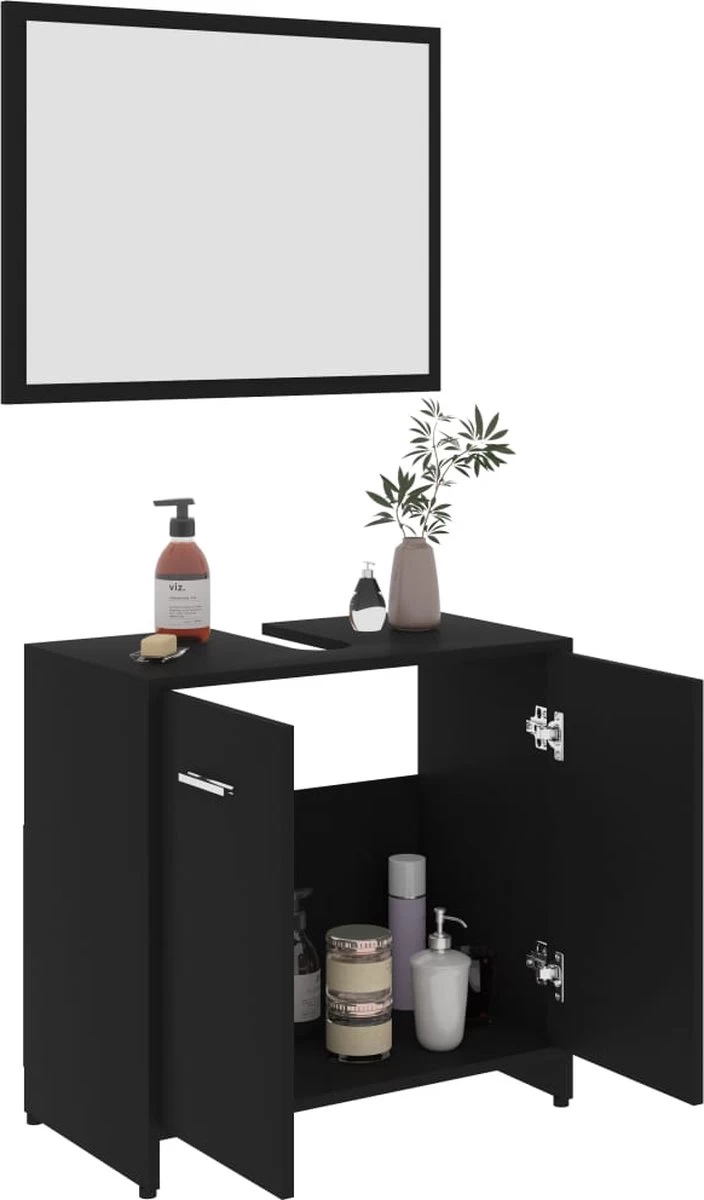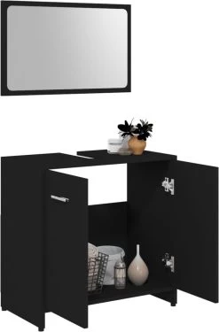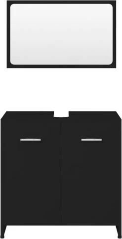 De meubelset, bestaande uit een spiegel en een kast, is gemaakt van duurzaam en stabiel spaanplaat. De chique kast is voorzien van 1 vak en 2 deuren en biedt voldoende opbergruimte om spullen in je badkamer op te bergen. Elke deur heeft een handvat voor gemakkelijk openen en sluiten. De spiegel geeft je interieur een prachtige uitstraling. Deze badkamerset is gemakkelijk schoon te maken met een vochtige doek.