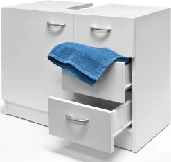 De wastafelkast biedt met zijn 3 lades en het royale opbergvak (voorzien van een deur) voldoende opbergruimte voor jouw badkamerbenodigdheden. Dankzij de uitsparing voor de waterafvoer past hij praktisch onder alle gangbare wastafels.