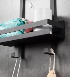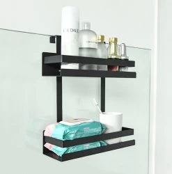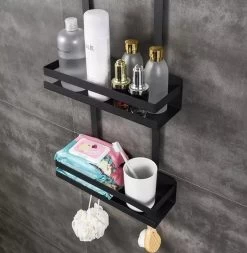 - Roest is geen partij – Het zwarte doucherek is van Rvs en is waterafstotend. Het is gemakkelijk schoon te spoelen, vanwege de open zijkanten. De doucheproducten blijven wel op hun plek door de extra rand.