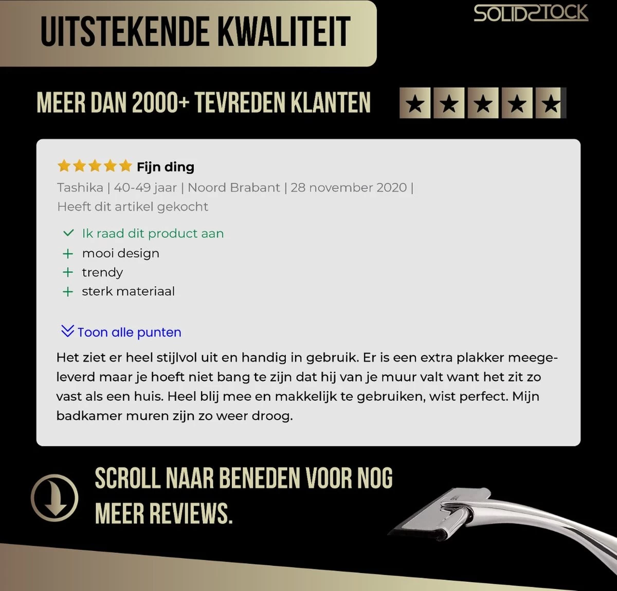 Vele klanten gingen je al voor en genieten nu van een luxe uitstralende en schone badkamer met deze SolidStock Douchetrekker. Door de 100% tevredenheidsgarantie loop je geen risico en kun je 30 dagen lang kosteloos retourneren. Leverbaar zolang de voorraad strekt.