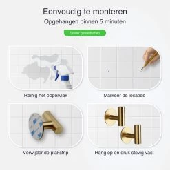 Handdoeken, theedoeken, vaatdoeken, als je ze gebruikt moeten ze droog en schoon zijn. Met deze handige ophanghaken, die je dankzij de sterke plakstrip makkelijk op een muur of kastje kunt plakken, heb je altijd een plekje om je doeken op te hangen. De zelfklevende haakjes zijn gemaakt van RVS, goud van kleur en eenvoudig te monteren. Je hoeft er namelijk niet voor te boren. Een must have voor je badkamer of keuken.
