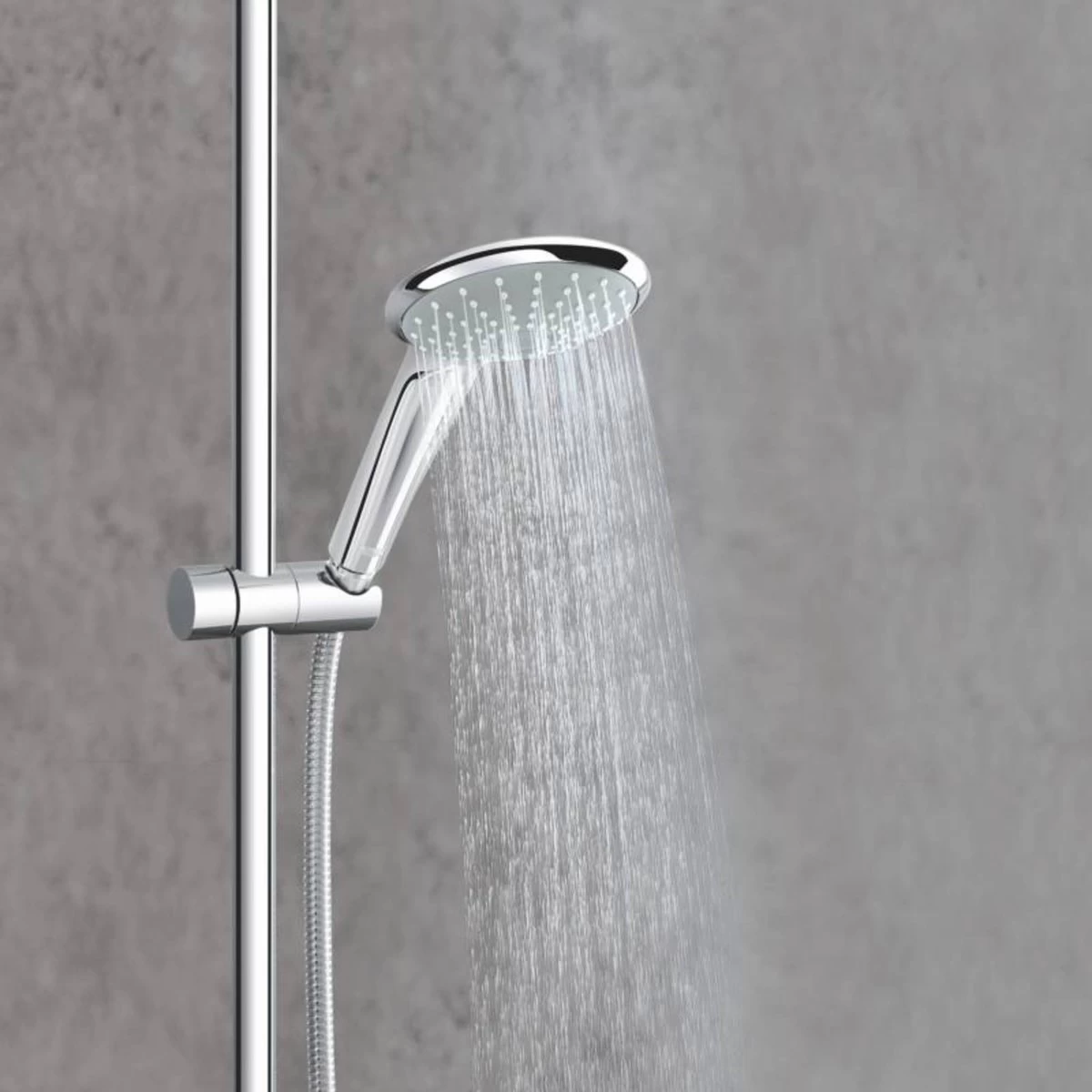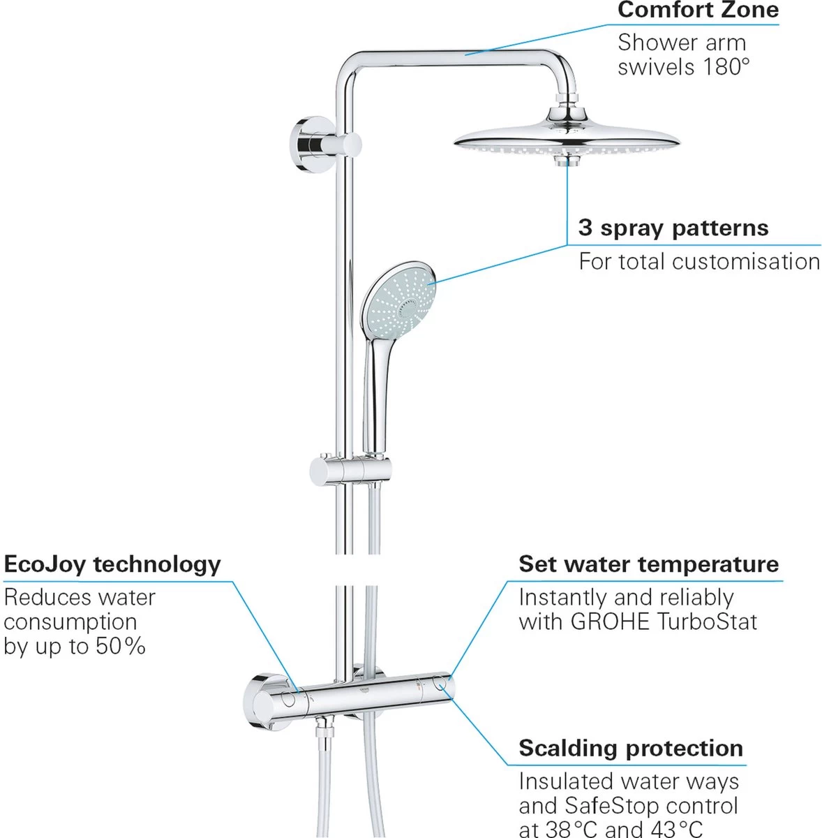 De gewenste temperatuur stel je gemakkelijk in met GROHE TurboStat. Het water blijft hierdoor op temperatuur, ook als de watertoevoer schommelt. De eenvoudige SafeStop knop beperkt de temperatuur tot maximaal 38˚C – ideaal als je kinderen alleen douchen – maar dit kan hoger gezet worden voor volwassenen. Dankzij de GROHE EcoJoy wordt het waterverbruik beperkt tot 9,5 l/min, maar is een complete douche-ervaring wel gegarandeerd.