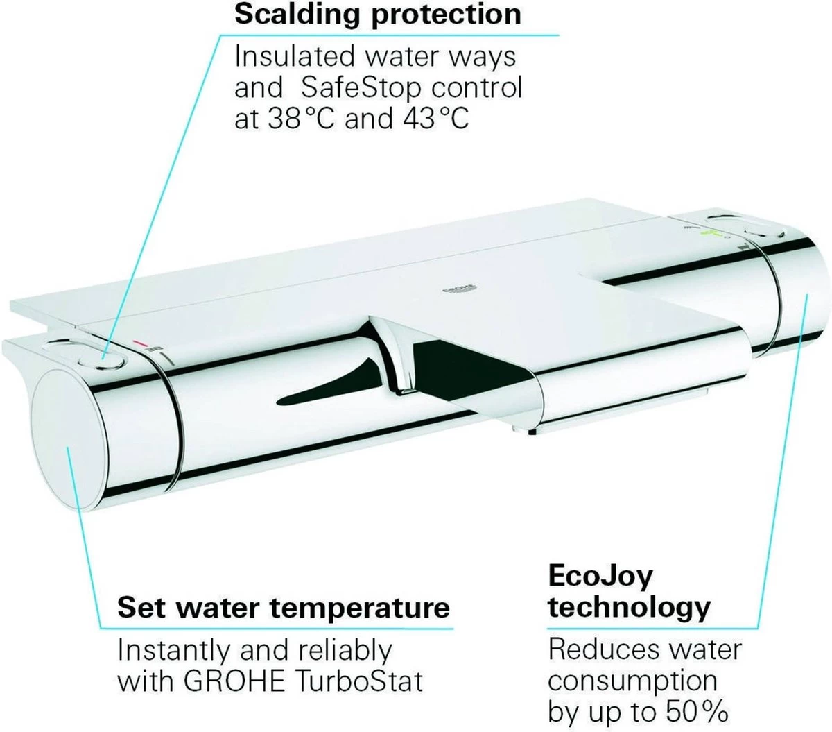 De AquaDimmer Eco zorgt voor het makkelijk switchen van de waterstroom van bad naar douche. Aan veiligheid is uiteraard ook gedacht. Door GROHE CoolTouch wordt de buitenkant van de kraan nooit warmer dan de ingestelde temperatuur en SafeStop zorgt ervoor dat de watertemperatuur nooit, zonder dat je het wilt, warmer wordt dan 38°C. Wel zo veilig, zeker bij kinderen. De chromen beschermlaag is krasvrij en onderhoudsvriendelijk en zorgt voor een jarenlange glans. En als je net als wij bij GROHE veel om het milieu geeft, dan is het goed om te weten dat de thermostaatkraan is uitgerust met een waterbesparingsknop bij de douche-uitgang waarmee je bij het douchen tot wel 50% op je waterverbruik kunt besparen.
