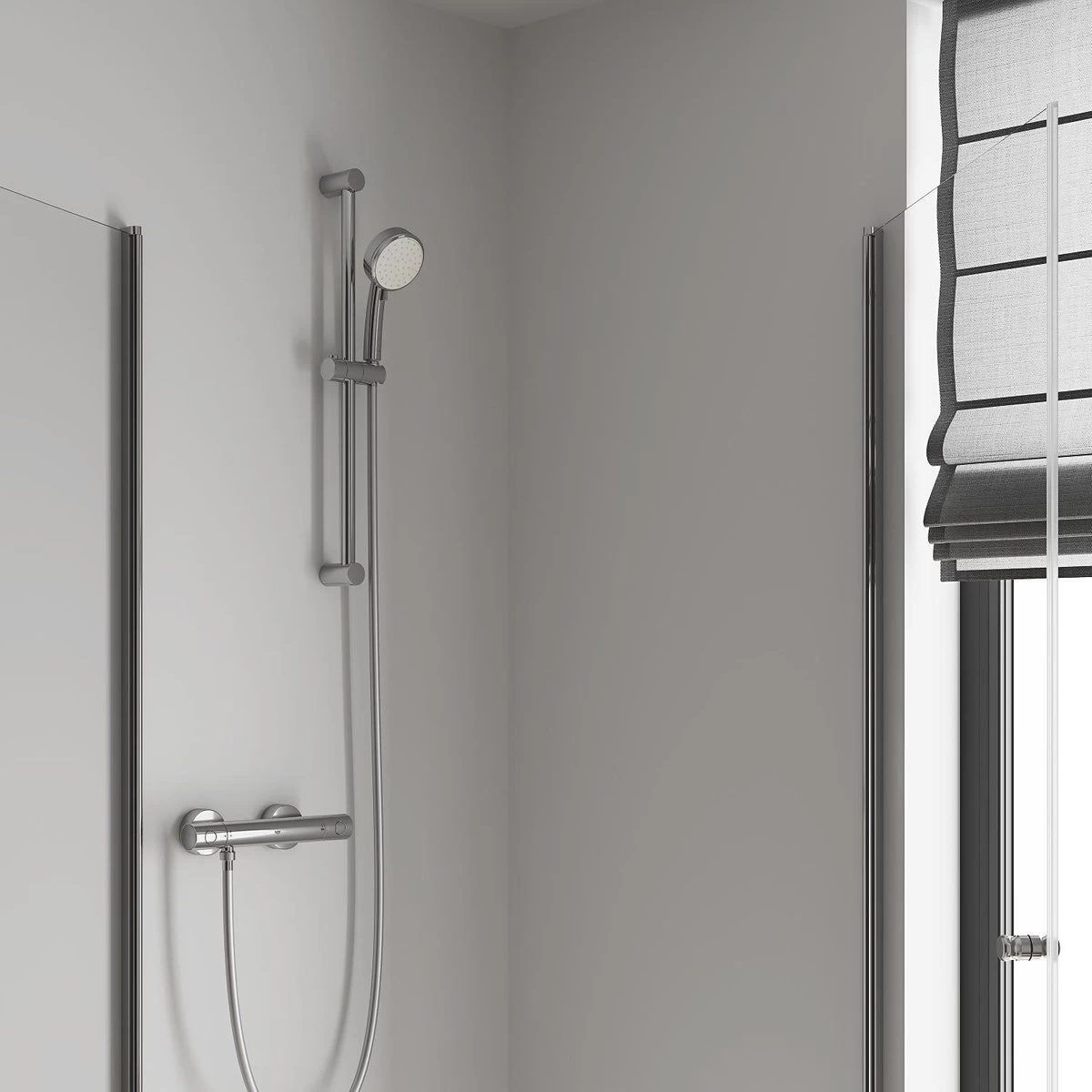 De Grohtherm 800 Cosmopolitan thermostatische doucheset is een totaaloplossing voor een plezierige, comfortabele en stijlvolle douche ervaring. GROHE TurboStat zorgt voor een constante toevoer van water op de perfecte temperatuur zonder onaangename schommelingen. Met GROHE SafeStop kun je een maximale temperatuur van 38 ° C instellen, terwijl SafeStop Plus nog een optionele limiet van 43 ° C biedt. Bediening is eenvoudig dankzij de GROHE MetalGrip met Ergorim, een verborgen rand aan de achterkant van de handvatten die een geweldige grip, zelfs met zeepachtige handen. De duurzame en onderhoudsvriendelijke GROHE StarLight chromen afwerking zorgt ervoor dat de mixer er jarenlang prachtig uitziet. De GROHE Tempesta Cosmopolitan 100 doucheset bestaat uit een handdouche met twee straalsoorten, de zacht ontspannende Rain-straal en de krachtige Jet-straal. Hierbij worden een 600 mm douchestang en 1750 mm slang meegeleverd.
