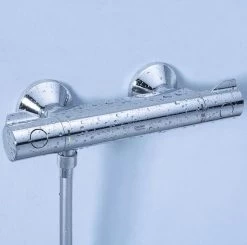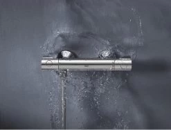 Onverwachte temperatuurschommelingen zijn met de GROHE Grohtherm 800 thermostatische douchemengkraan verleden tijd. Met deze stijlvolle kraan blijft de douchetemperatuur via GROHE TurboStat constant én verbruik je tot wel 50% minder water tijdens het douchen. De watertemperatuur stel je eenvoudig in via de ergonomische handgrepen met intuïtieve GROHE EasyLogic bediening. De douchekraan is tevens voorzien van GROHE SafeStop waarmee je de temperatuur vooraf kunt instellen op maximaal 38°C. Zo kunnen ook kinderen veilig douchen zonder zich te verbranden aan heet water. De GROHE Grohtherm 800 thermostatische douchemengkraan ziet er schitterend uit in glanzend chroom. En deze glans blijft mooi behouden door de krasbestendige en onderhoudsvriendelijke GROHE Starlight afwerking.