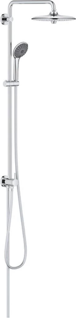 Met het indrukwekkende douchesysteem met omstelling voeg je meteen design en een aangename douchebeleving toe aan een moderne badkamer. Dit systeem is perfect als je snel je badkamer wilt opknappen omdat je je huidige douchekraan kunt gebruiken. Je hebt dit systeem dus in een handomdraai geïnstalleerd. Dit systeem is geproduceerd in Duitsland en uitgerust met de geavanceerde technologie van GROHE. Hiermee ben je dus verzekerd van topprestaties. GROHE EcoJoy beperkt het waterverbruik tot 9,5 l/min maar je bent wel verzekerd van een complete douche-ervaring. De GROHE DreamSpray verdeelt het water gelijkmatig over alle sproeigaatjes.