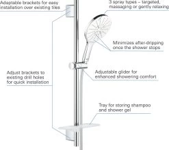 Wanneer je het water uitzet, minimaliseert GROHE DripStop het nadruppelen van de Rain en Jet spray. En dankzij GROHE DreamSpray heeft de stroom van elk sproeigaatje bij elke straalsoort een perfect uitgebalanceerde stroom voor maximale tevredenheid, en de siliconen SpeedClean antikalk sproeigaatjes zijn ook nog eens extra gemakkelijk schoon te maken. Het beschikt daarnaast over GROHE EcoJoy, dat de waterstroom beperkt tot 9,5 l/min, maar ook zorgt voor pure verwennerij en de krasbestendige GROHE StarLight chrome afwerking zal jarenlang sprankelen. Bovendien voorkomt de Inner WaterGuide dat het oppervlak te heet wordt, waardoor zowel je huid als het sprankelende chrome worden beschermd. Installatie is ook een fluitje van een cent – het GROHE Fastfixation-systeem zorgt ervoor dat je bestaande boorgaten kunt gebruiken, terwijl GROHE TileFix je de flexibiliteit geeft om de diepte van elke beugel aan te passen om een perfecte pasvorm te creëren, ideaal voor gedeeltelijk betegelde badkamer.