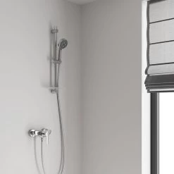 De douche heeft een universeel bevestigingssysteem dat past op alle standaard doucheslangen. Deze set kun je installeren in combinatie met een geiser.