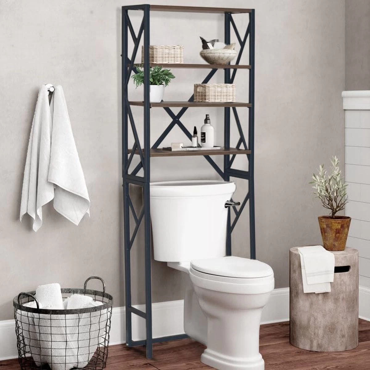 Spulletjes in je badkamer opbergen? Niet altijd even makkelijk. Een extra kast aanschaffen in de bij-kamer of op zolder? Waar kun je alles kwijt? Homestic© beantwoordt deze vraag graag voor je. Dit doen we met de trendy Rizaion toiletmeubel, dat naast haar praktische eigenschappen ook een zeer elegante toevoeging aan je interieur is. De roestvrijstalen Rizaion badkamermeubel kan eenvoudig over het toilet geplaatst worden, waardoor het geen extra ruimte inneemt in je badkamer of toilet. Ondanks dit biedt het veel ruimte om al je badkamerspullen op te slaan. Met haar industriele look en houten elementen, is de Rizaion WC Wandkast ook nog eens een enorm elegante toevoeging aan het design van je badkamer of toilet! Het doel van Homestic© is namelijk om gemak en rust te brengen bij jou thuis, en om hierbij ook het aanzicht van je interieur naar het volgende niveau te tillen.