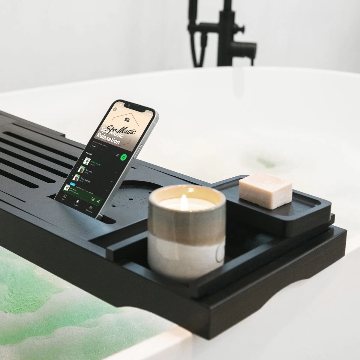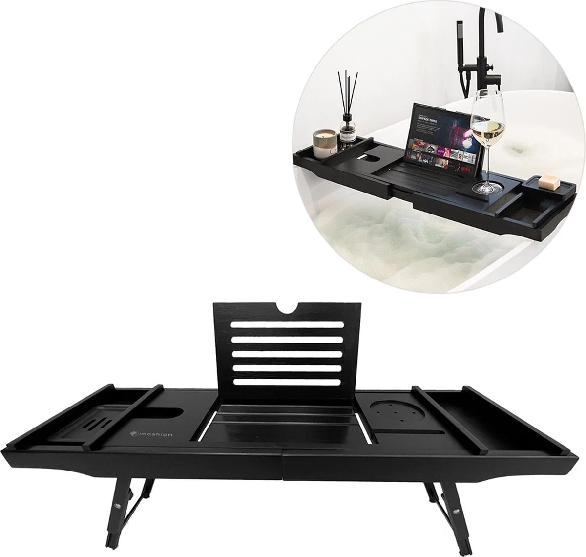 Het badrekje van iMoshion beschikt over meerdere uitsparingen voor bijvoorbeeld glazen, geurstokjes of kaarsen. Zo creëer je gemakkelijk een ontspannen sfeer tijdens het badderen. Ook beschikt het rekje over een handige zeephouder en een bakje voor overige toiletspullen. Daarnaast heeft het badrekje een uitschuifbare houder voor je tablet, smartphone of een boek. Zo kun je optimaal genieten van jouw favoriete serie, film of boek.
