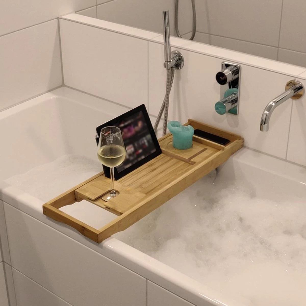 De bamboe badbrug is voorzien van onder andere een tablethouder / boekhouder, waardoor u ontspannen in bad kunt genieten van een boek of een serie. Daarnaast heeft de badplank een glazen houder en kaarsenhouder om helemaal tot ontspanning te kunnen komen. Verder heeft de badbrug nog een opbergvak voor bijvoorbeeld een telefoon, zeep of scheermes.