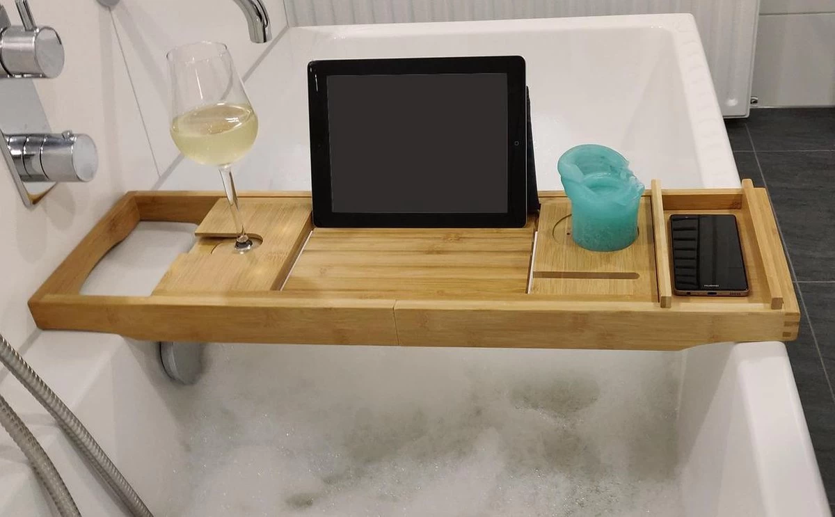 Met deze handige bamboe badbrug geniet u nóg meer van een welverdiend rustmoment. De badbrug, ook wel badplank, is uitschuifbaar waardoor u verzekerd bent van de juiste pasvorm over uw badrand. Creëer uw eigen spa-moment en geniet (alleen óf samen) van een warm bad met kaarslicht, ontspannende muziek, een goed boek en een heerlijk glas wijn. Met onze bamboe badbrug heeft u alle benodigdheden bij de hand en hoeft u uw warm ontspanningsmoment nooit meer te onderbreken. Het exotische bamboe geeft de badbrug een exclusieve en rustieke uitstraling waardoor u zich in uw eigen wellnesscentrum waant.