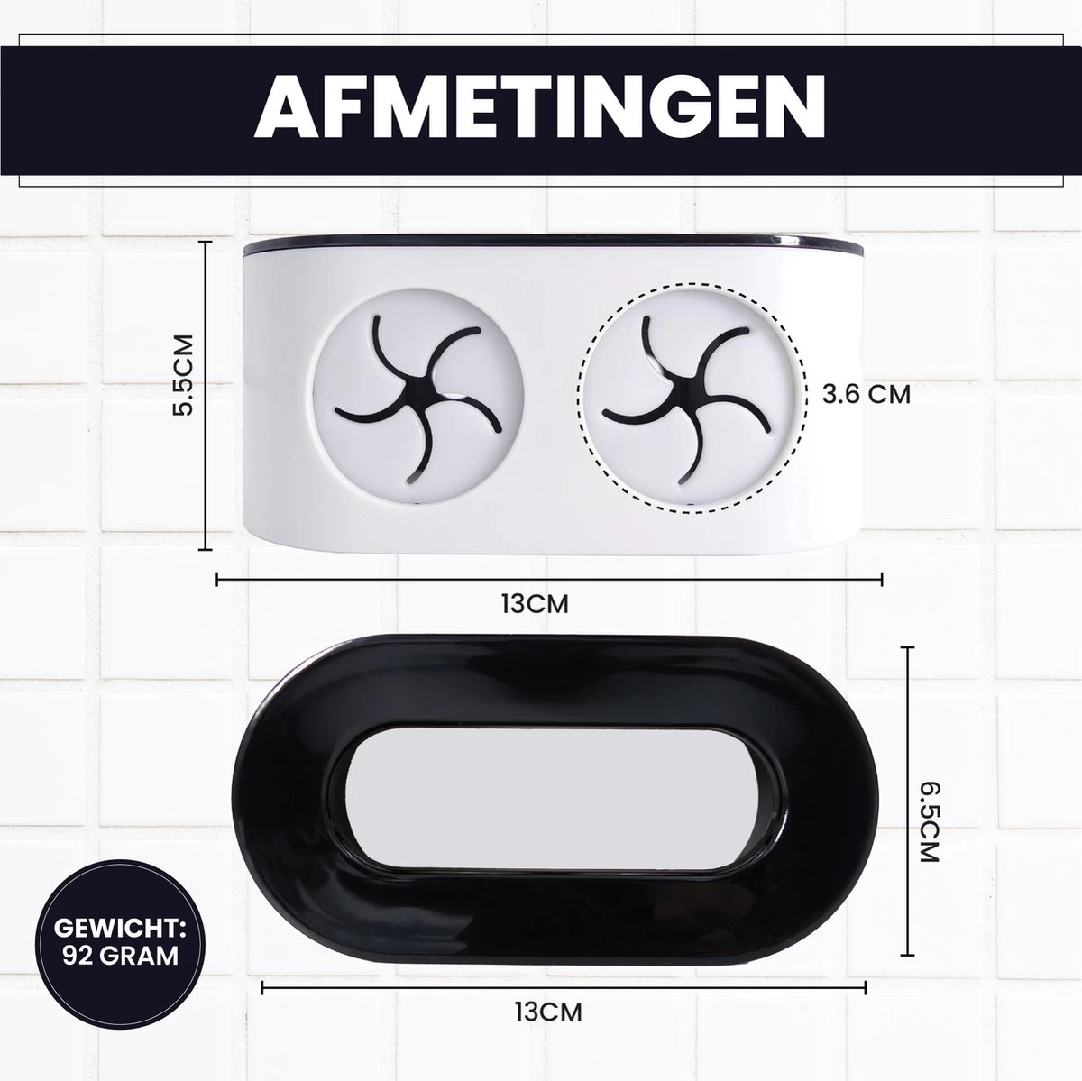 Je tandenborstels liggen in de badkamer en vallen steeds in de gootsteen. De tandenborstels van verschillende mensen raken elkaar aan, waardoor het niet meer hygiënisch is. Met deze tandenborstelhouder is je badkamer netjes opgeruimd en zijn je tandenborstels hygiënisch opgeborgen. Er is ruimte voor twee elektrische tandenborstels.