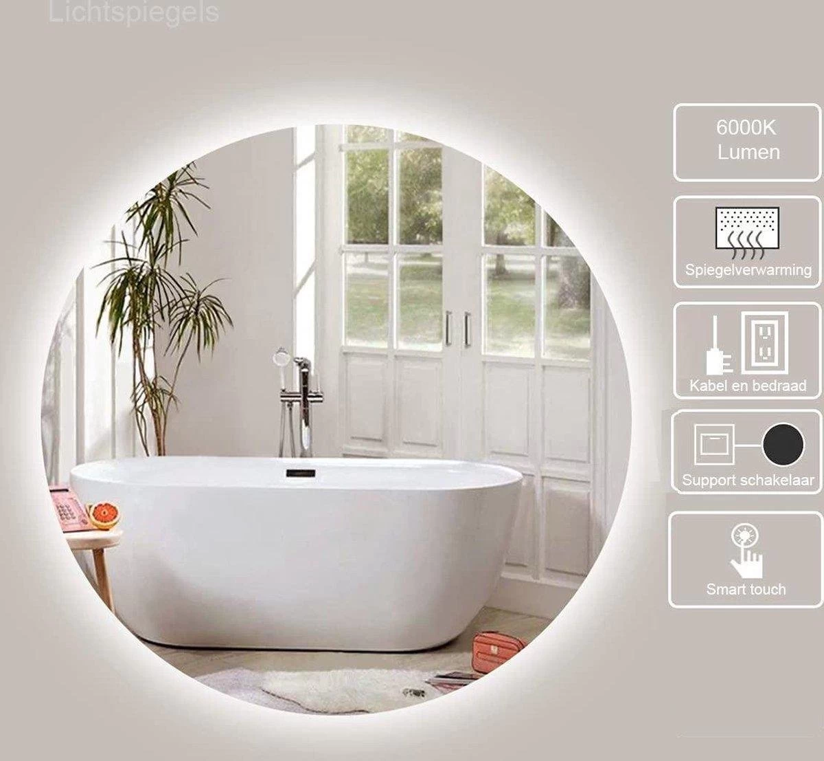 Verder kunt u kiezen uit 3 verschillende kleurtemperaturen (warm, koel en natuurijk licht). Het licht van de spiegel heeft een kleurtemperatuur van 6000K. De spiegel heeft een breedte en hoogte van 100 cm.