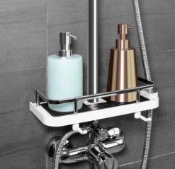 Het doucherek is fijn vormgegeven, voorzien van een zwarte en witte afwerking en gemaakt van stevig plastic met een zilverkleurig hekje. Met een lengte van 27cm heeft het doucherek meer dan voldoende ruimte voor al uw doucheproducten!
