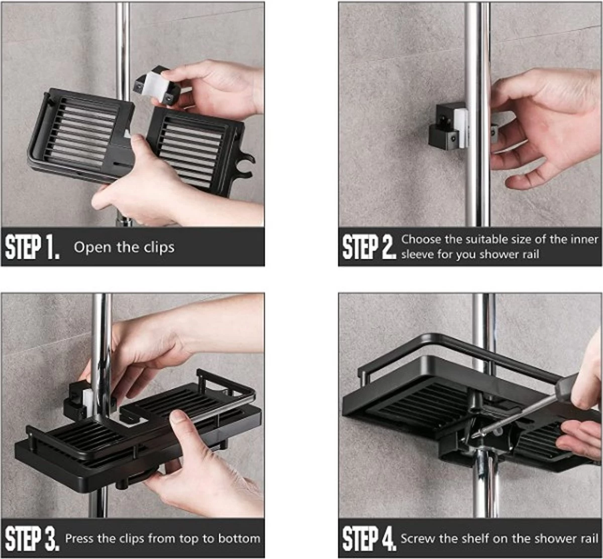 Dit wil zeggen dat je hem snel en eenvoudig moet kunnen bevestigen aan je douchestang of kraan. Het klemsysteem zorgt ervoor dat het doucherek stevig blijft zitten en niet loskomt bij te zwaar gewicht van bijvoorbeeld meerdere shampooflessen.