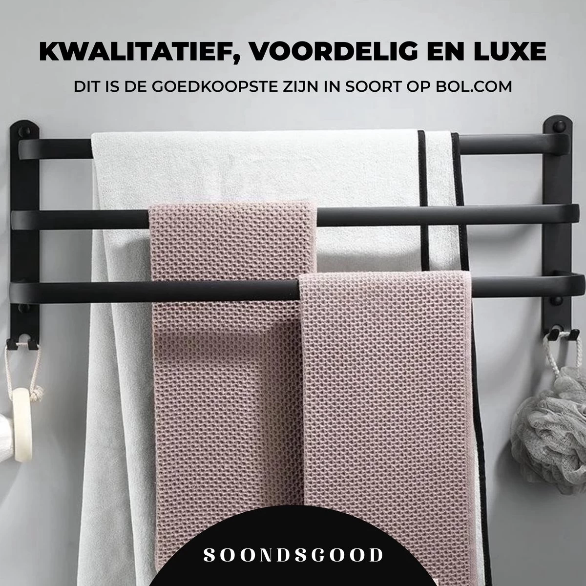 Dit handdoekrek is de trend van het moment! Met dit rek breng je die gave industriele look in huis die we kennen van o.a. de stalen deuren. Het handdoekrek is van het merk Soondsgood dit merk staat voor kwaliteit en luxe. De hernieuwde 2021 collectie voldoet aan alle eisen en is supermakkelijk te installeren met lijm of bijgeleverde schroeven. De stijlvolle armen bieden plaats aan meerdere handdoeken en geven een optimale invulling aan de ruimte rondom de wastafel. Het 3-armige handdoekrek is daarnaast eenvoudig te bevestigen en de bevestigingsmaterialen zijn amper zichtbaar. Bestel vandaag het handdoekrek van Soondsgood Dit rek wordt vaker aangeboden via bol maar dit is de meest voordelige!