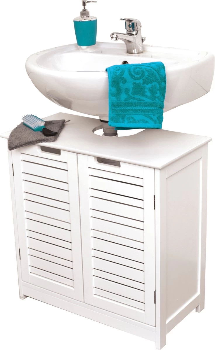 Eenvoudige maar elegante wastafel onderkast: deze badkamerkast heeft een mooie frisse uitstraling met zijn witte MDF body. De wastafelonderkast is geschikt voor de meeste wastafels door de uitsparing voor de sifon. Hij heeft door de slim gekozen afmetingen een zee van opbergmogelijkheden en past toch in de meeste compacte badkamers.