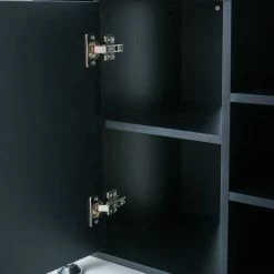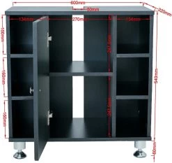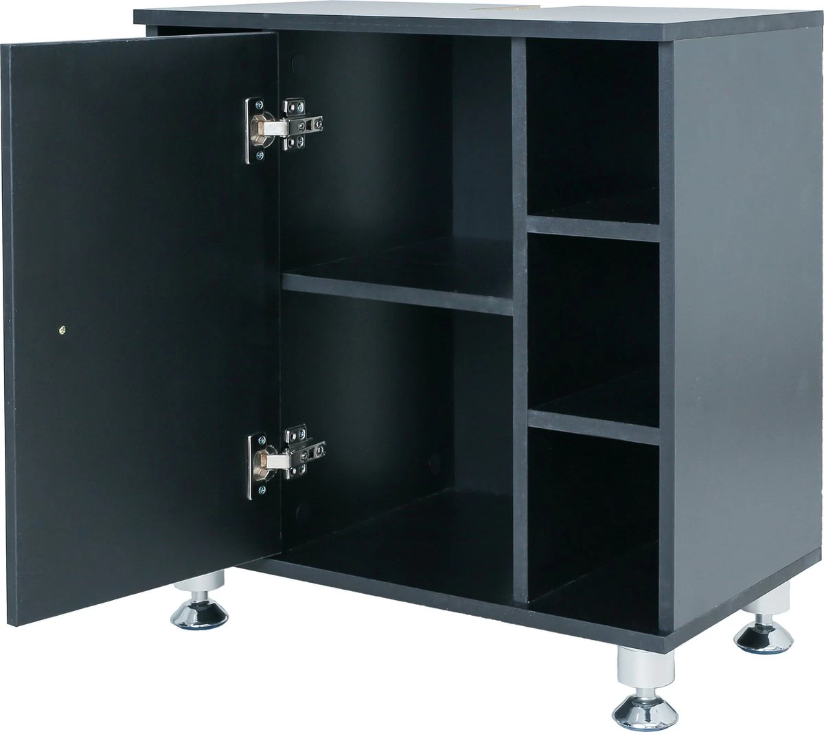 Deze onderkast voor onder de wastafel is ideaal voor elke badkamer. Het wastafel onderbouw meubel is ruimtebesparend en biedt voldoende opbergmogelijkheden zodat uw badkamer ordelijk blijft. De vier pootjes bieden de juiste stabiliteit. Het meubel heeft 6 kleine open opbergvakken, 3 rechts en 3 links en in het midden 1 groot opbergvak met 1 legplank die afgesloten kan worden door middel van een openslaande deur. Kleur: zwart. Afmetingen: hoog 62 cm breed 60 cm diep 32 cm. Levering is inclusief handleiding en benodigde montagematerialen.