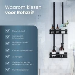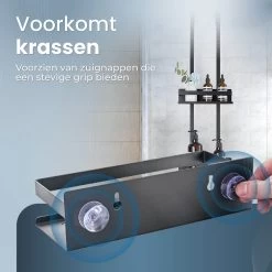 Het doucherek is gemaakt van roestvrij staal en komt in een stijlvolle, zwarte kleur. De RVS doucherek bestaat uit twee lagen en heeft genoeg opbergruimte voor alle doucheproducten. Dankzij de zuignappen aan de achterkant is het doucherek extra stevig. Let er wel op dat het doucherek alleen geschikt is voor een douchewand met een maximale dikte van 23 millimeter.