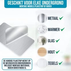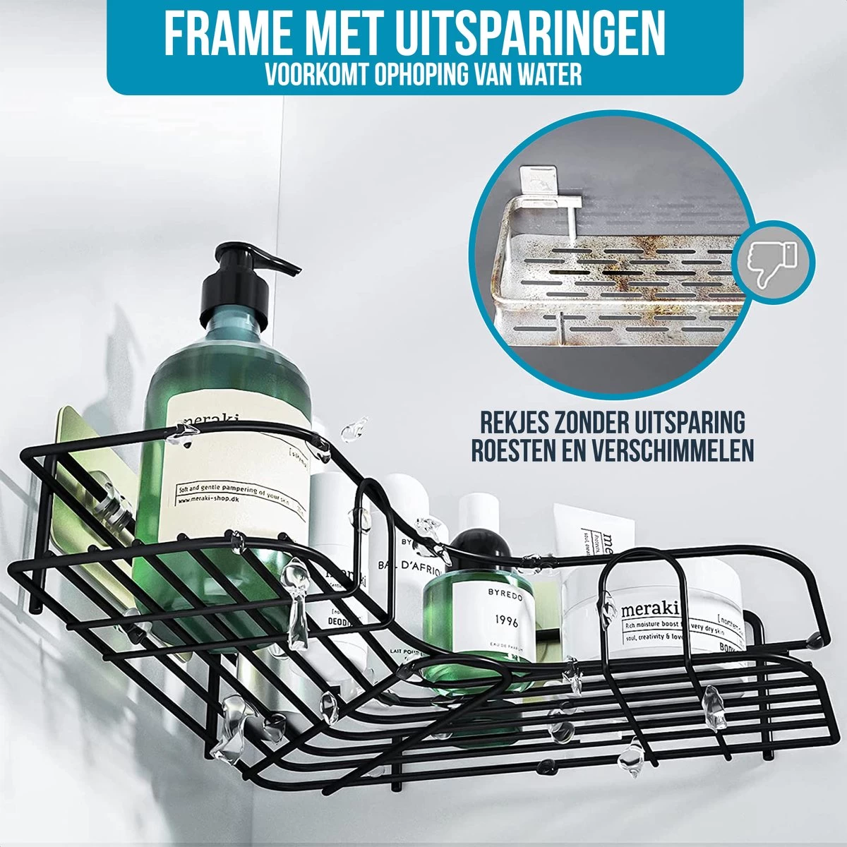 Wil jij jouw douchespullen netjes opbergen zonder gaten in de muur? Dan is een zelfklevend badkamerrek perfect voor in jouw douche! Onze doucherek set is bevestigd binnen 1 minuut, bevat een handige rand, wat zorgt voor extra gemak omdat je flessen niet kunnen omvallen en biedt genoeg ruimte voor al jouw bad spullen. Met sterk RVS materiaal en een draagkracht van 10 kg staat jouw nieuwe en stijlvolle badkamerrek stevig, zonder boor of schroef.