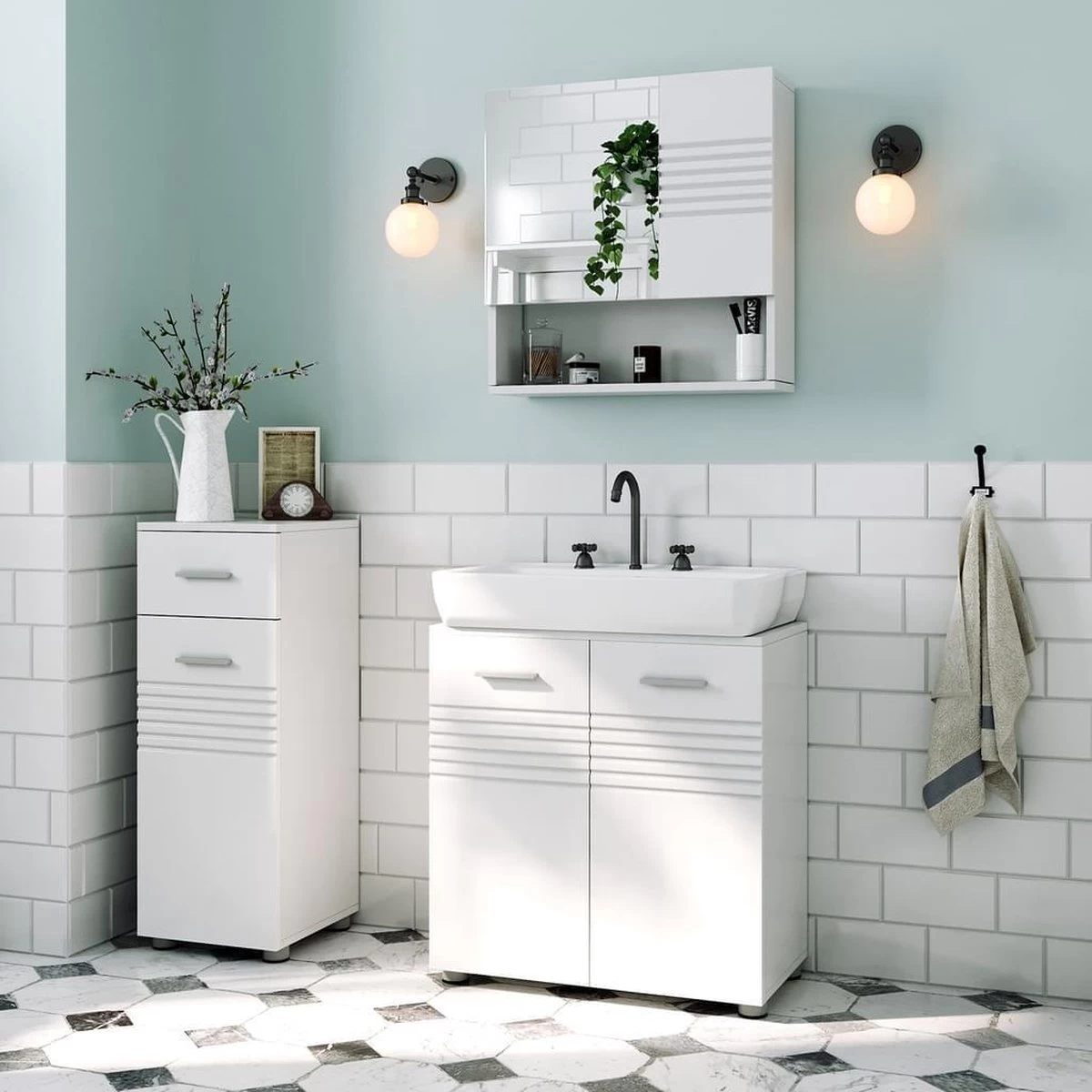 Versier lege muren in de badkamer met deze spiegelkast. De matwitte, met melamine gecoate spaanplaat, glanzend witte, PVC-gecoate MDF-deur en gehard glas van de spiegel voegen een vleugje frisheid toe aan uw badkamer.