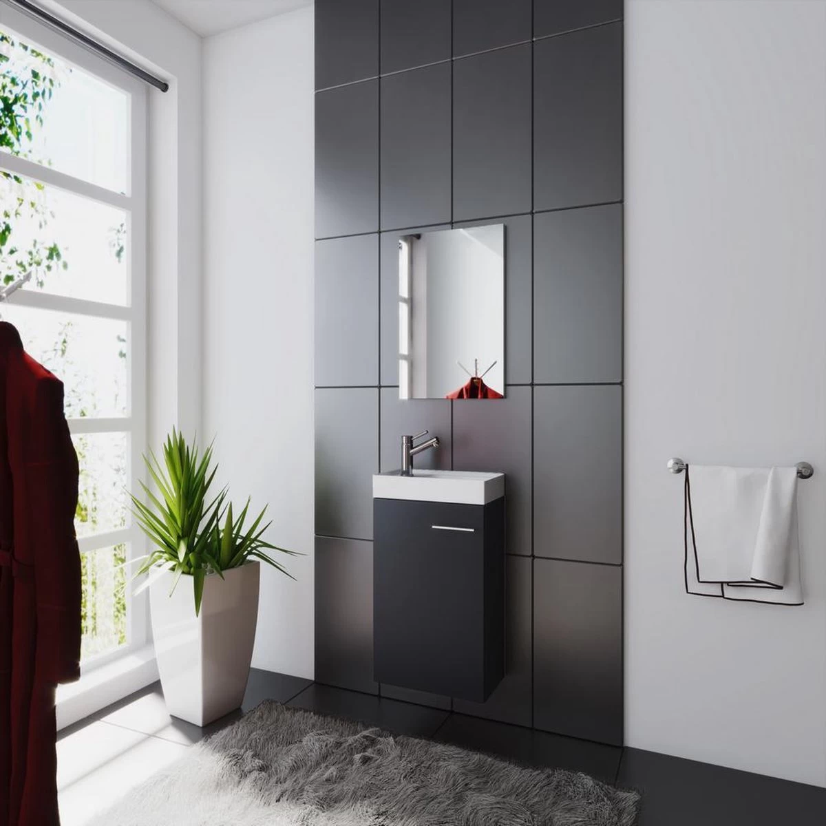 De wastafel is een klein wonder van ruimte. De set bestaat uit een spiegel en een wastafel met badmeubel. Een zeer elegante inrichtingsoplossing voor toiletten of gastentoiletten om een visueel hoogtepunt te creëren. Highlights: – 1 spiegel van ESG veiligheidsglas – wastafelonderkast incl. wastafel – deur met edele reliëfgreep – 1 groot gesloten vak Afmetingen onderkast + wastafel Afmetingen ca. b. 41 x h. 68 x d. 22 cm Afmetingen spiegel Afmetingen ca. b. 40 x h 60 x cm VCM is al sinds de jaren 70 gespecialiseerd in het ontwerpen, produceren en distribueren van meubelen met een eerlijke prijs/prestatieverhouding en heeft er al miljoenen huishoudens mee verfraaid.
