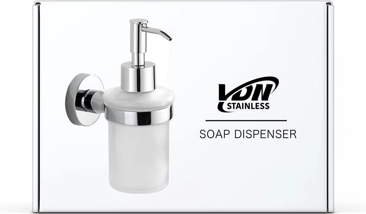 Het zeeppompje van VDN Stainless is uitgevoerd in chroom en is zeer eenvoudig te vullen met vloeibare zeep. Met de bijgeleverde bevestigingsmaterialen is het zeeppompje eenvoudig op de gewenste positie op de wand te bevestigen. De zeepdispenser is gemaakt van metaal en het reservoir van matglas.