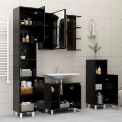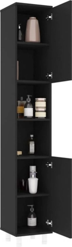 Deze chique kast is gemaakt van spaanplaat, waardoor hij stevig en stabiel is. De kast heeft 6 vakken en 2 deuren en biedt verschillende opbergmogelijkheden en extra ruimte om spullen in je badkamer op te bergen. Elke deur heeft een handvat voor gemakkelijk openen en sluiten. De kast is gemakkelijk schoon te maken met een vochtige doek.