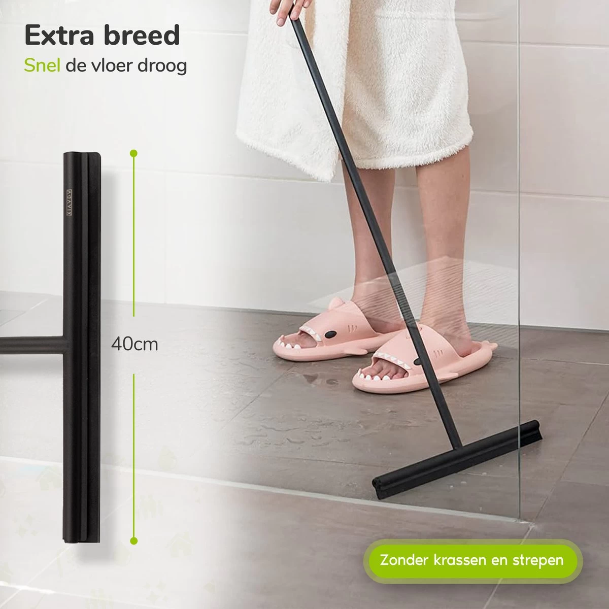 Door de brede wisser van 40 cm trek je snel het overtollige water en vuil van de vloer. Zonder strepen en krassen.