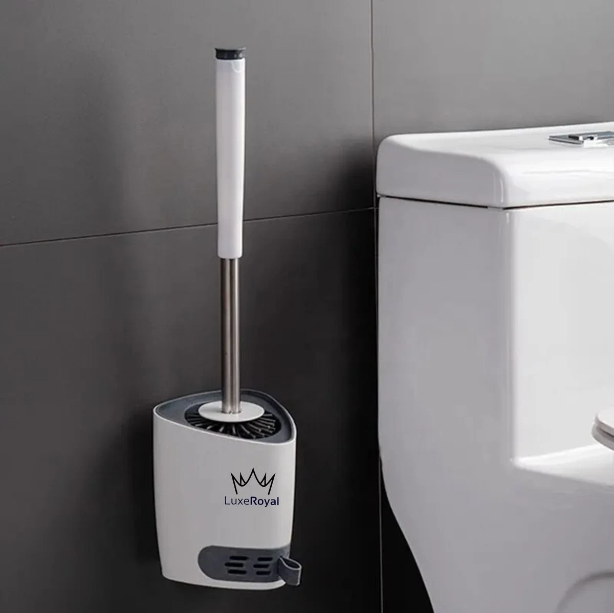 De toiletborstelhouder heeft een gleuf aan de zijkant en aan de houder zit een zelfklevende haak waarmee deze aan de muur kan worden bevestigd. De compacte toiletborstel en houder kunnen ook op de grond blijven staan als u dit prefereert. Het is uw vrije keuze! De LuxeRoyal toiletborstelhouder heeft een verborgen ventilatieontwerp, waardoor hij handig kan worden gereinigd, gedroogd en afgevoerd. Het ontwerp van de houder en borstel zijn strak waardoor hij mooi in uw toilet of badkamer staat.