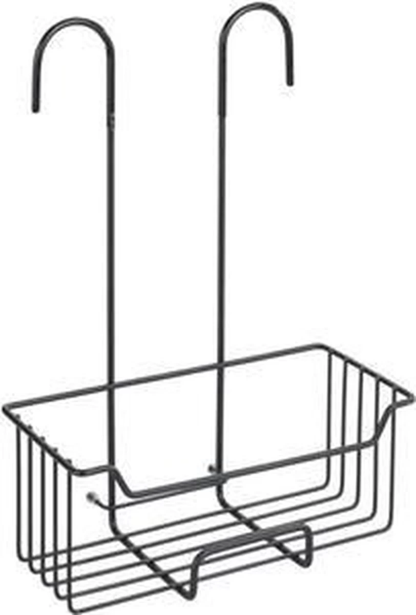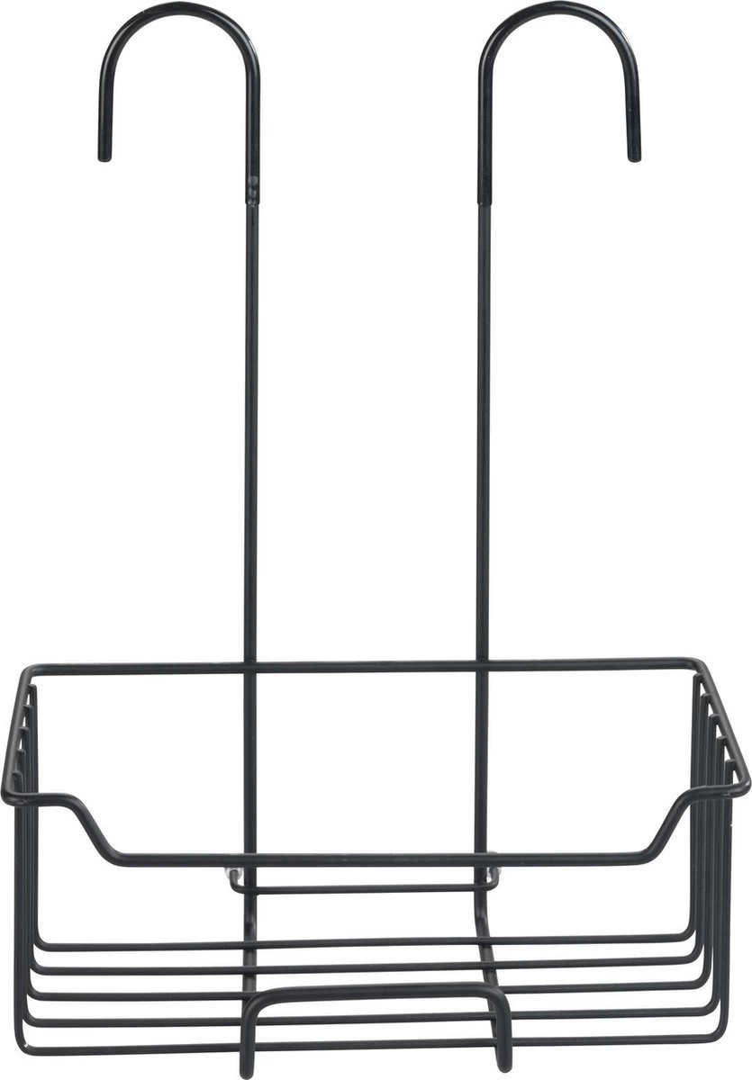 De Milo is een compact en stijlvol hangend doucherekje in zwart RVS met veel opbergruimte voor shampoo en zeep.