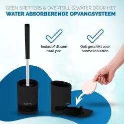 De luxe toiletborstel met houder is voorzien van een water-absorberend opvangsysteem, hierdoor heb je nooit meer last van vieze waterspetters op de vloer en muur. Het overtollige water wordt opgevangen in een bakje welke is voorzien van een diatom mud pad welke het water meteen opzuigt zodat de houder droog blijft. Bovendien is de houder zeer hygiënisch dankzij het ingebouwde ventilatiesysteem, dat voorkomt dat bacteriën zich kunnen ophopen in de houder. De houder kan op de grond geplaatst worden of eenvoudig aan de muur worden opgehangen zonder boren, dankzij de bijgeleverde plakstrip.